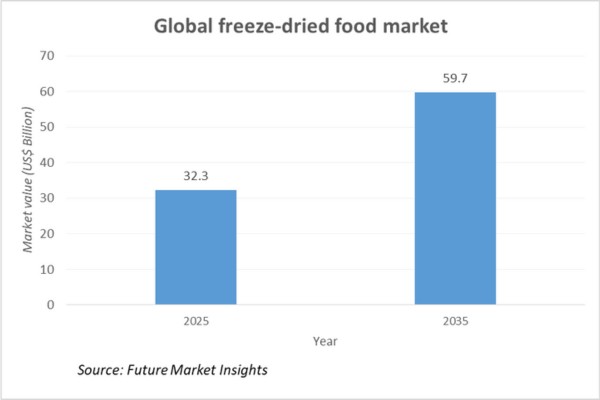 According to a report by Future Market Insights, the global freeze-dried food market is estimated at US$ 32.3 billion in 2025 and is projected to reach US$ 59.7 billion by 2035, reflecting a CAGR of 6.3%.