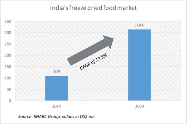 The freeze-dried food market in India stood at US$ 109 million in 2024 and is expected to surge to US$ 314.63 million by 2033, registering a CAGR of 12.5% between 2025 and 2033, as per a report by IMARC Group.